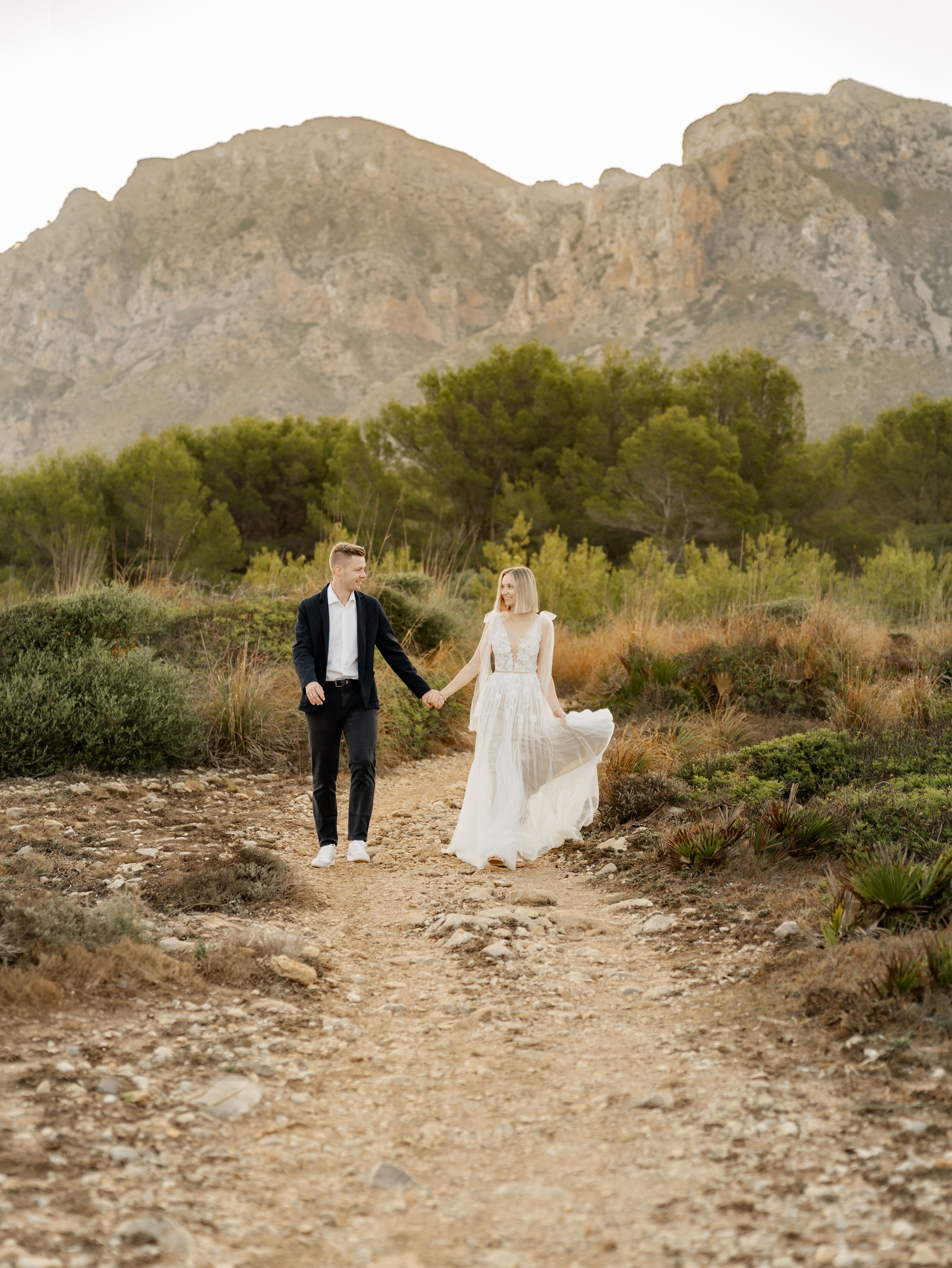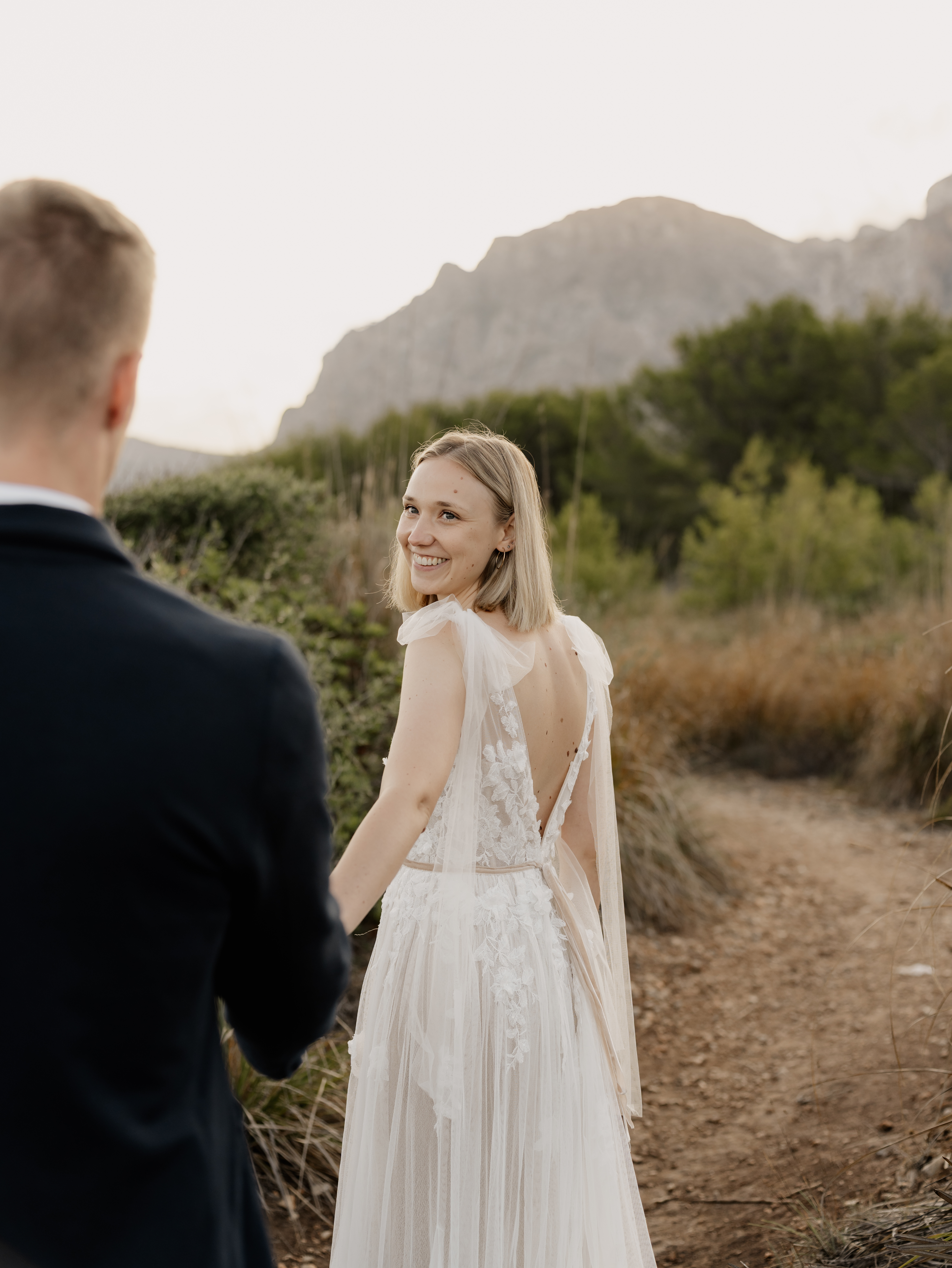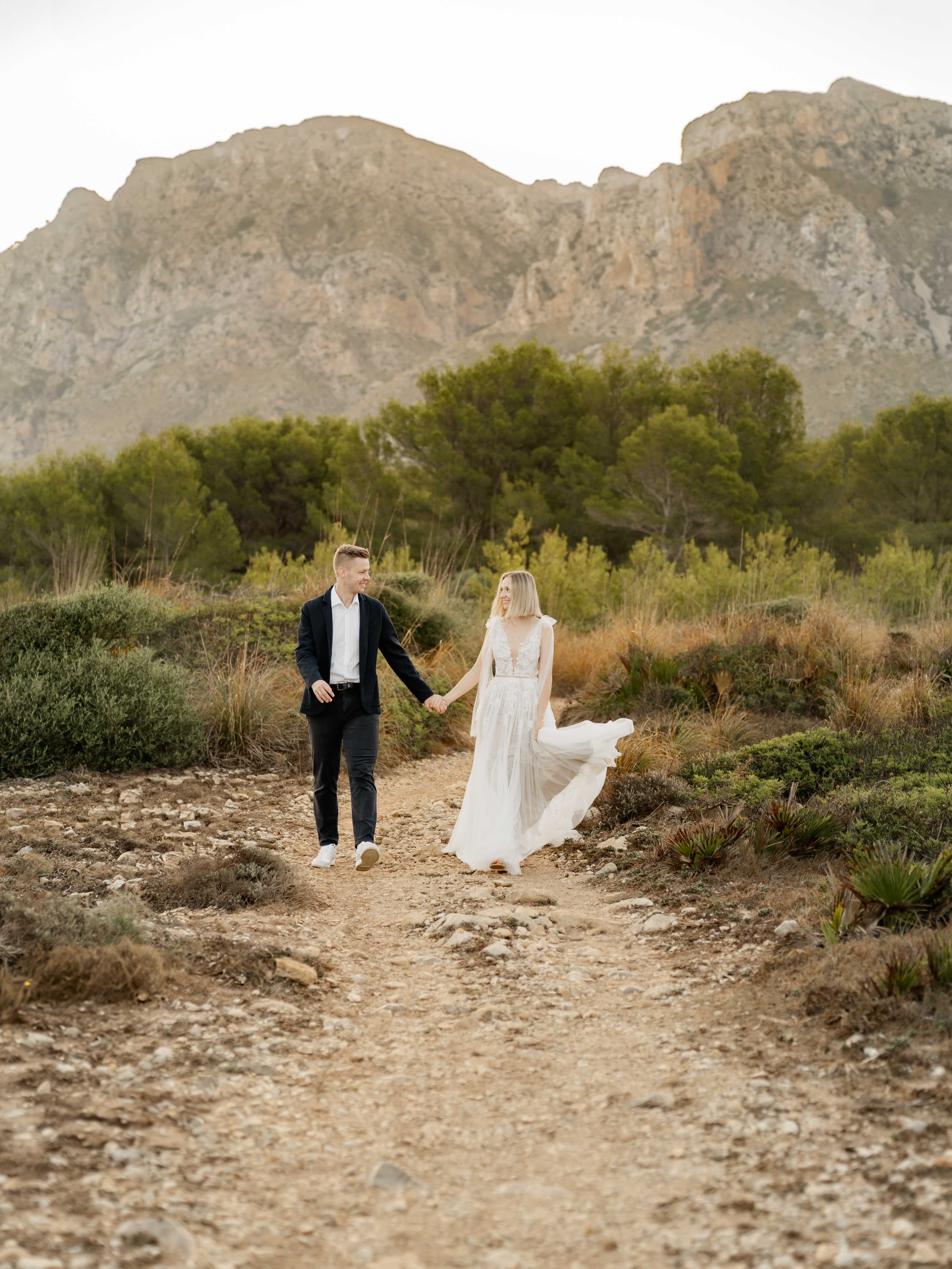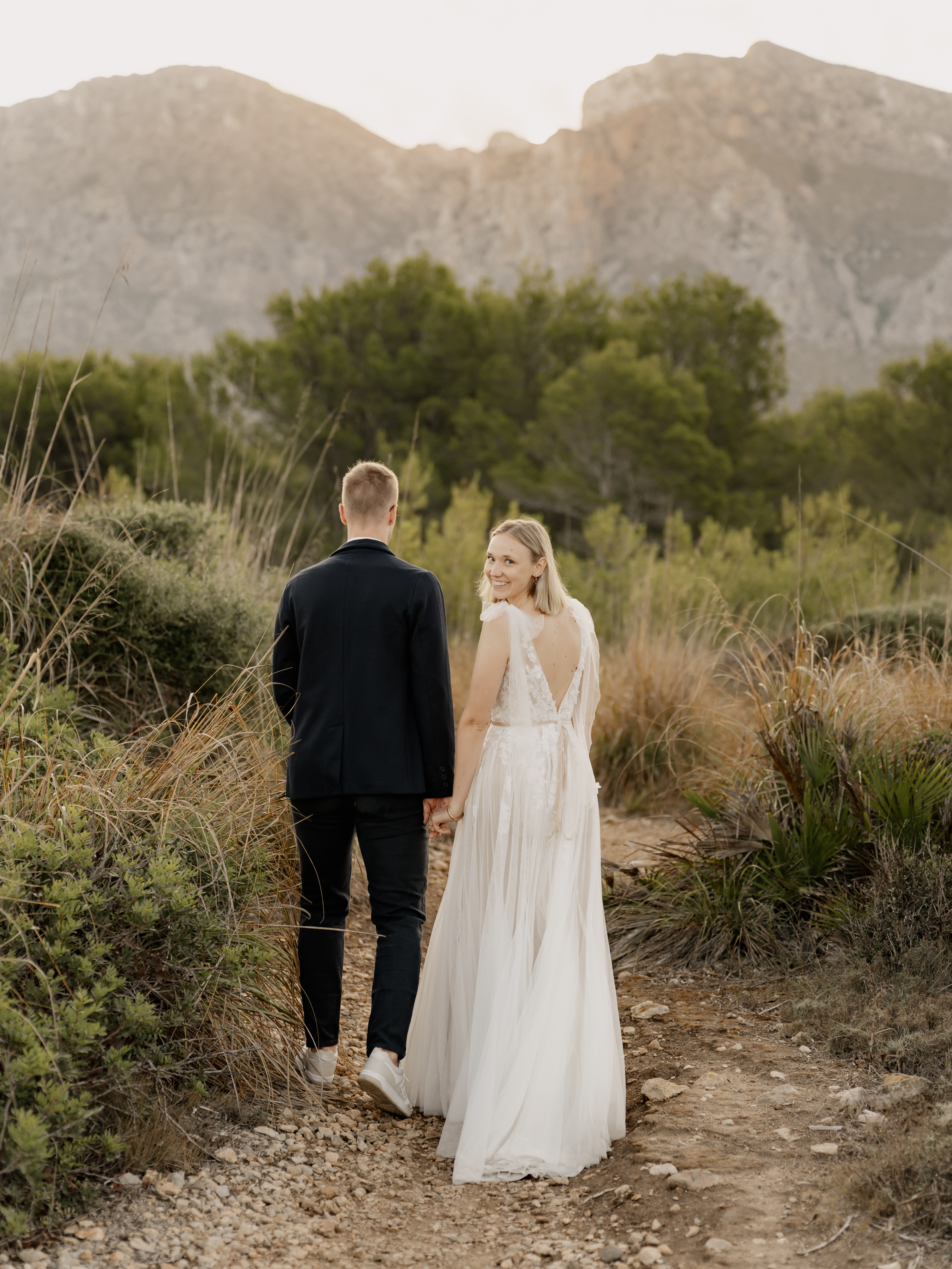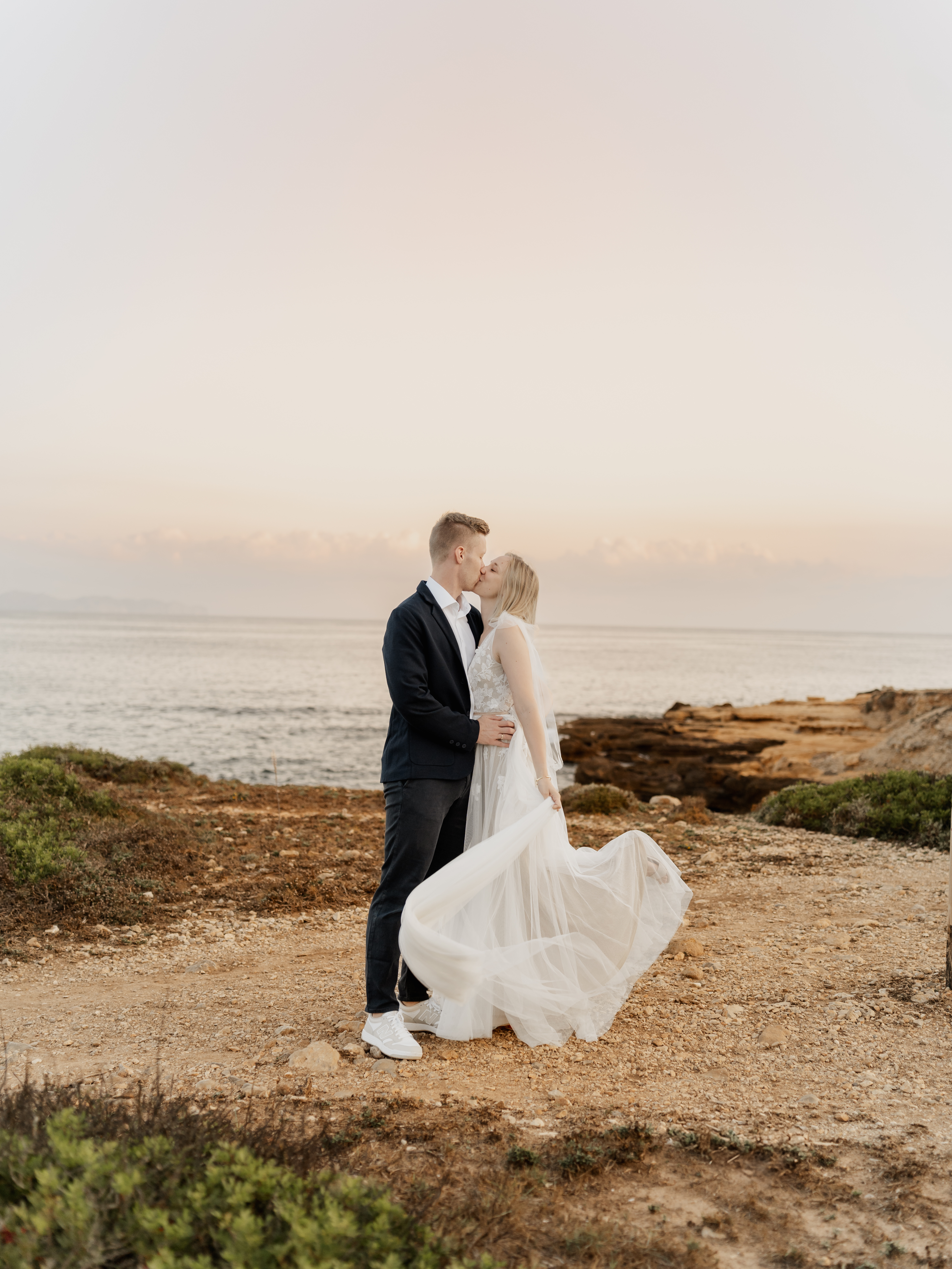 Denn an unserem Hochzeitstag regnete es unaufhörlich. Das Brautpaarshooting, auf das ich mich als Braut und Fotografin so sehr gefreut hatte, war nicht möglich. Doch ich wusste: diese Bilder würden wir nachholen. Und zwar an einem Ort, der für uns beide viel bedeutet – während unserer Flitterwochen an den rauen Küsten von Mallorca, in der ersten Morgenstunde, wenn das Licht der Golden Hour die Insel in ein weiches, goldenes Leuchten taucht.