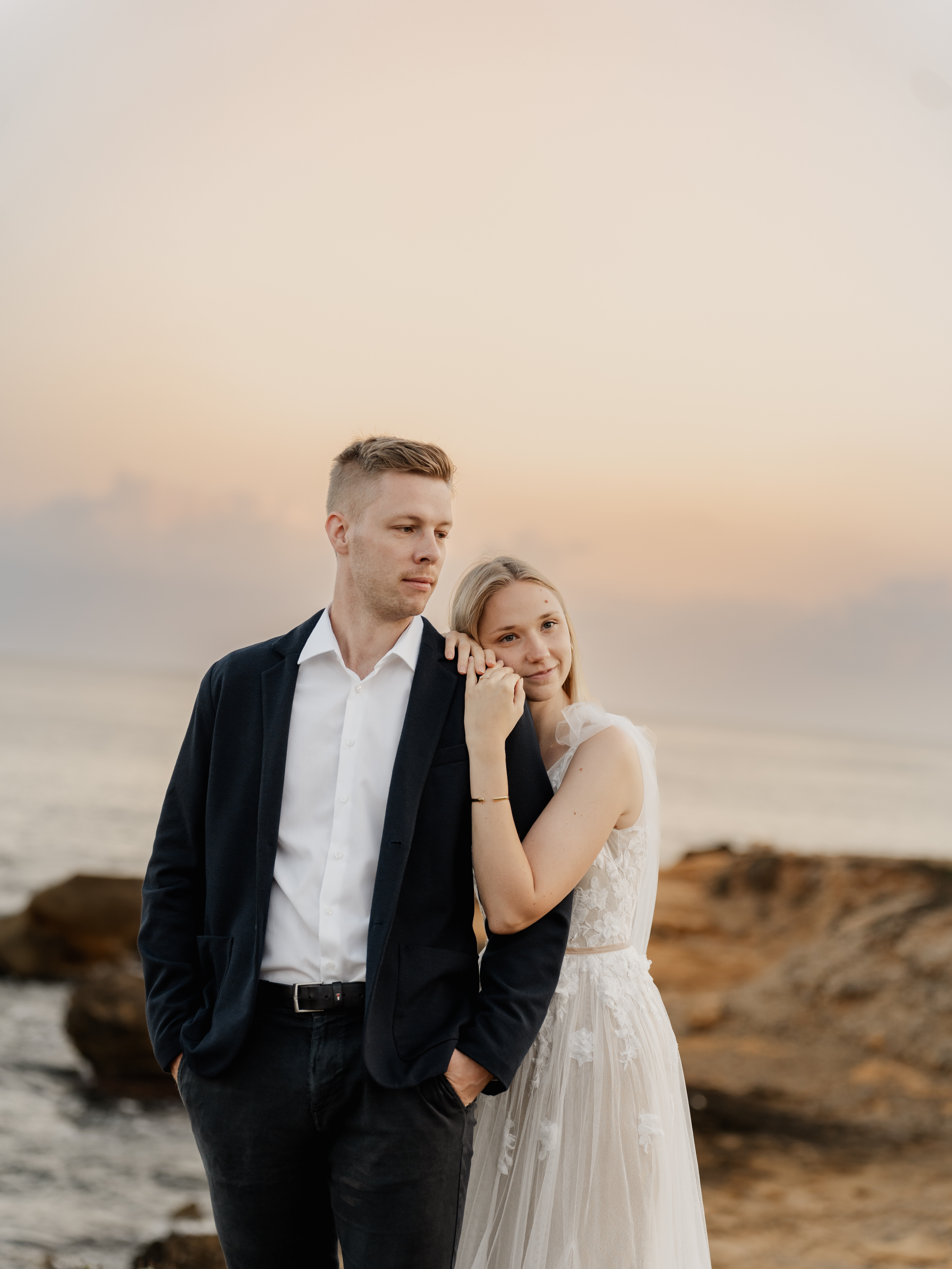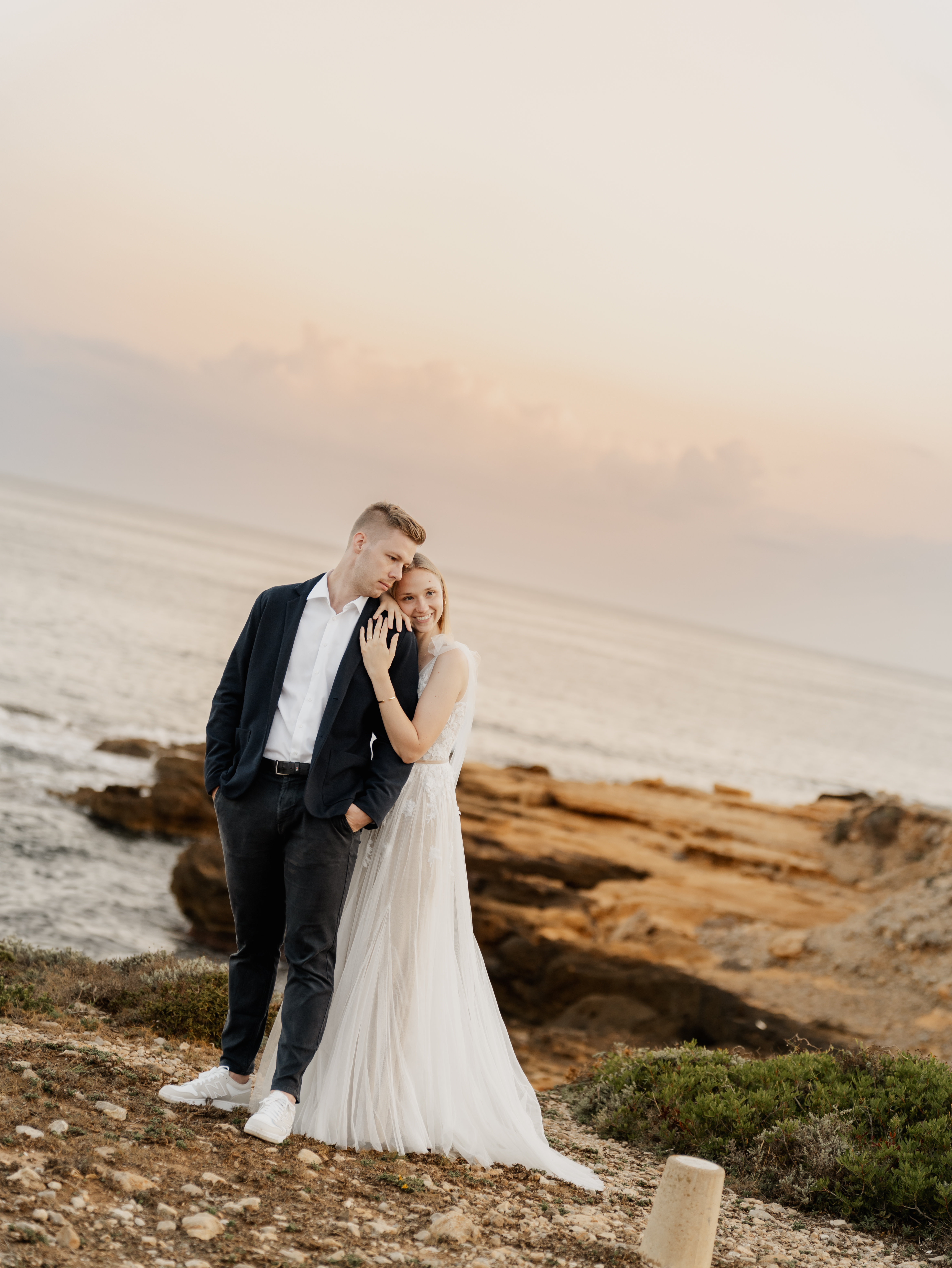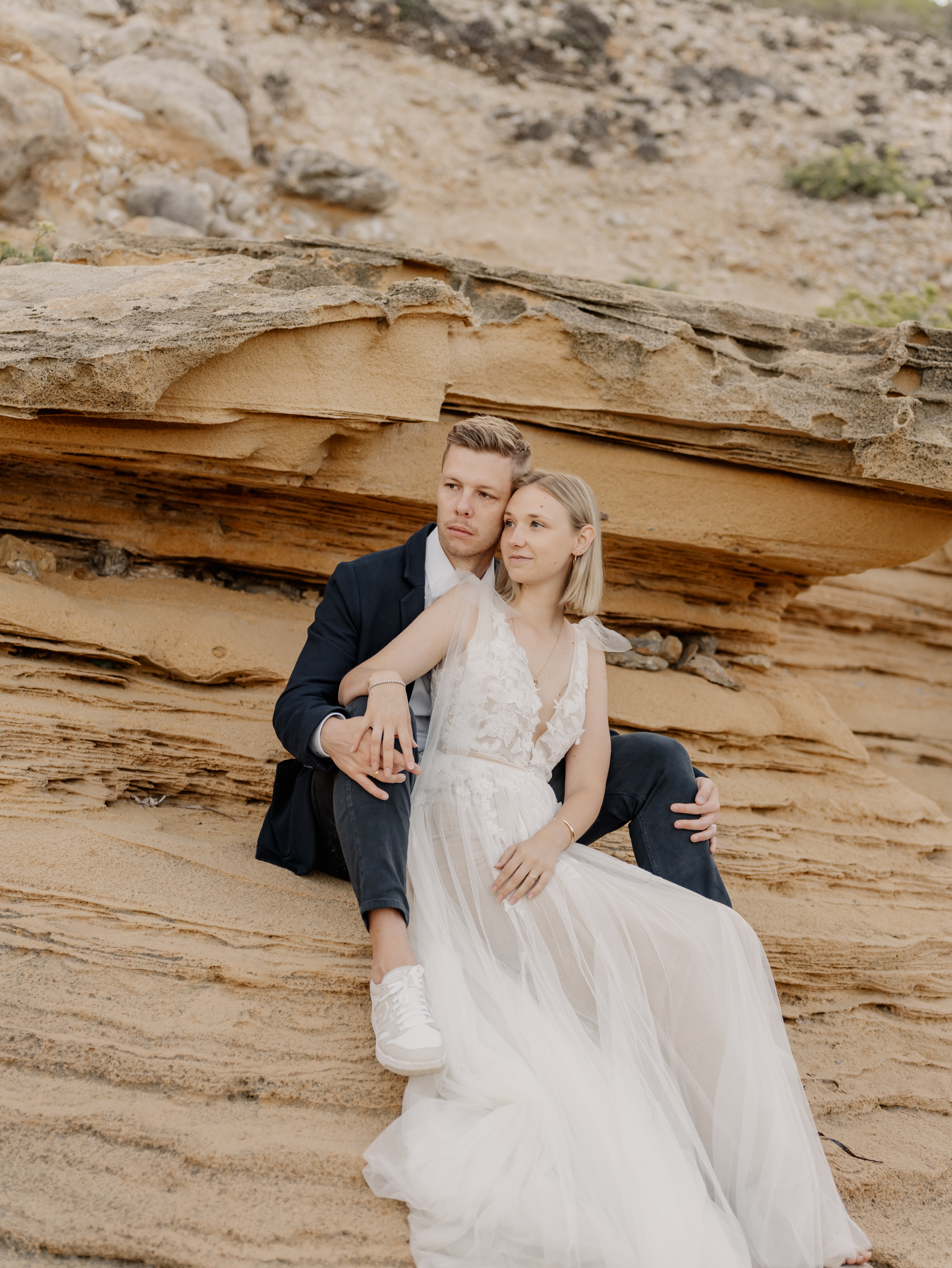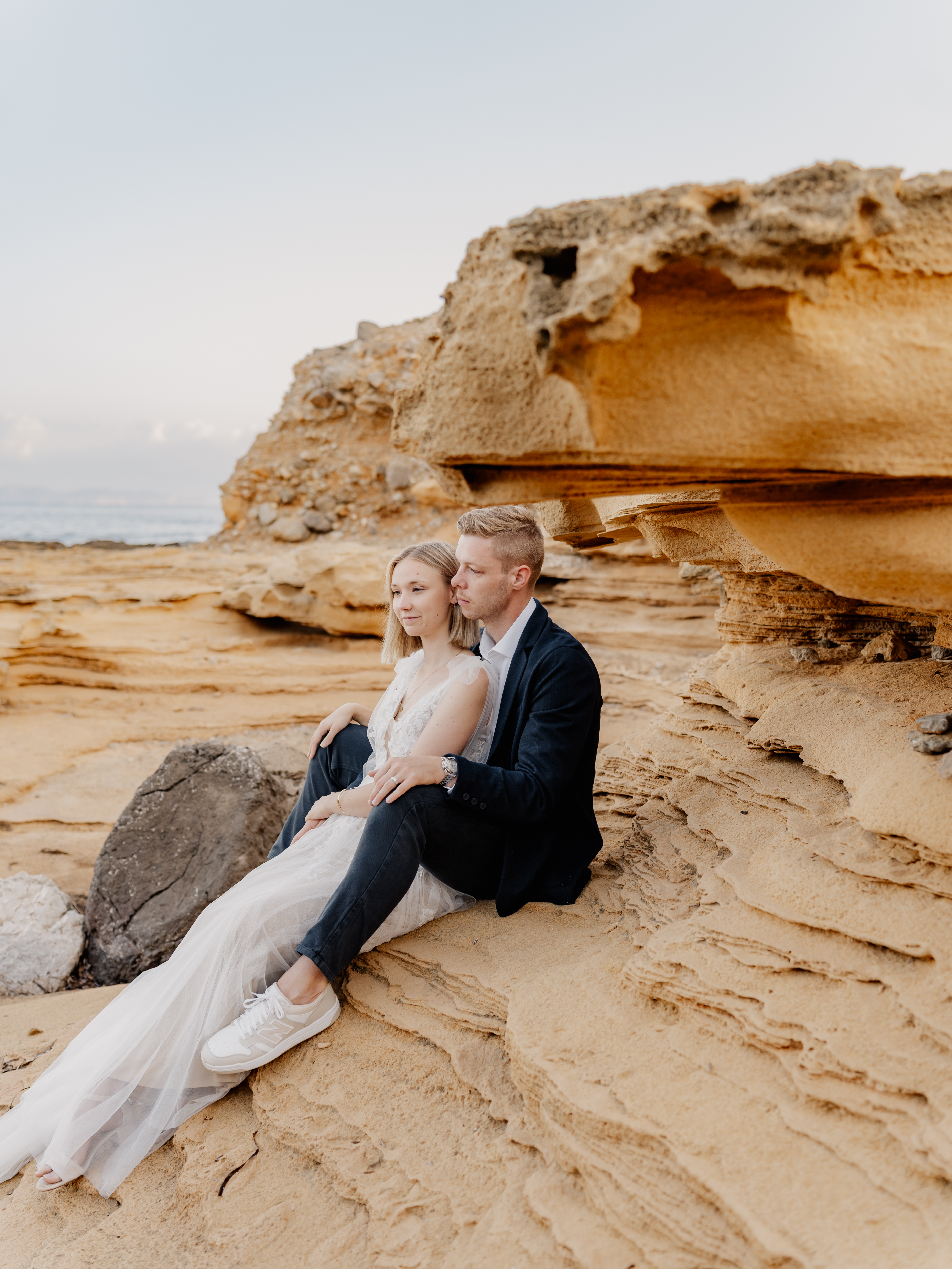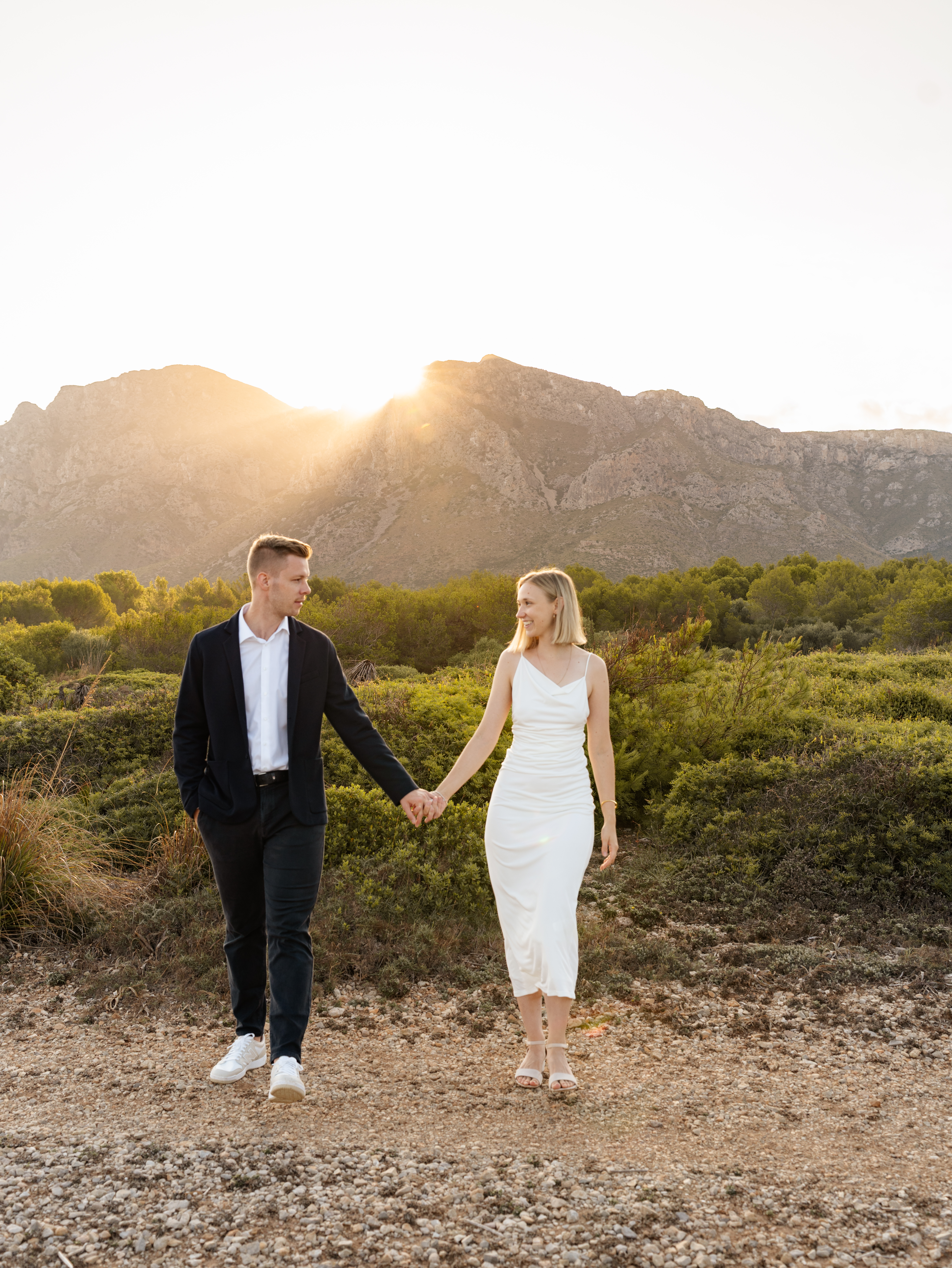 Denn an unserem Hochzeitstag regnete es unaufhörlich. Das Brautpaarshooting, auf das ich mich als Braut und Fotografin so sehr gefreut hatte, war nicht möglich. Doch ich wusste: diese Bilder würden wir nachholen. Und zwar an einem Ort, der für uns beide viel bedeutet – während unserer Flitterwochen an den rauen Küsten von Mallorca, in der ersten Morgenstunde, wenn das Licht der Golden Hour die Insel in ein weiches, goldenes Leuchten taucht.