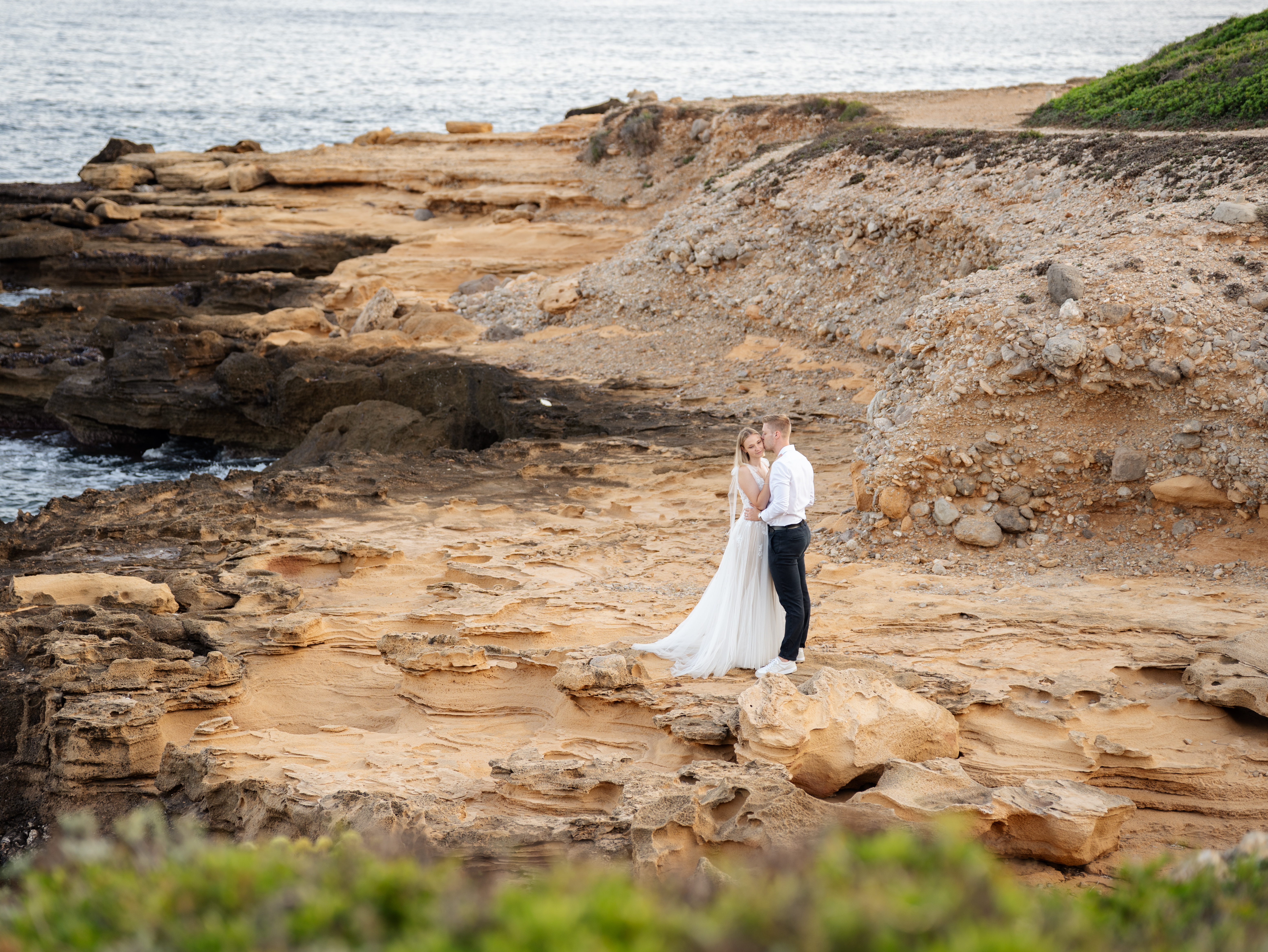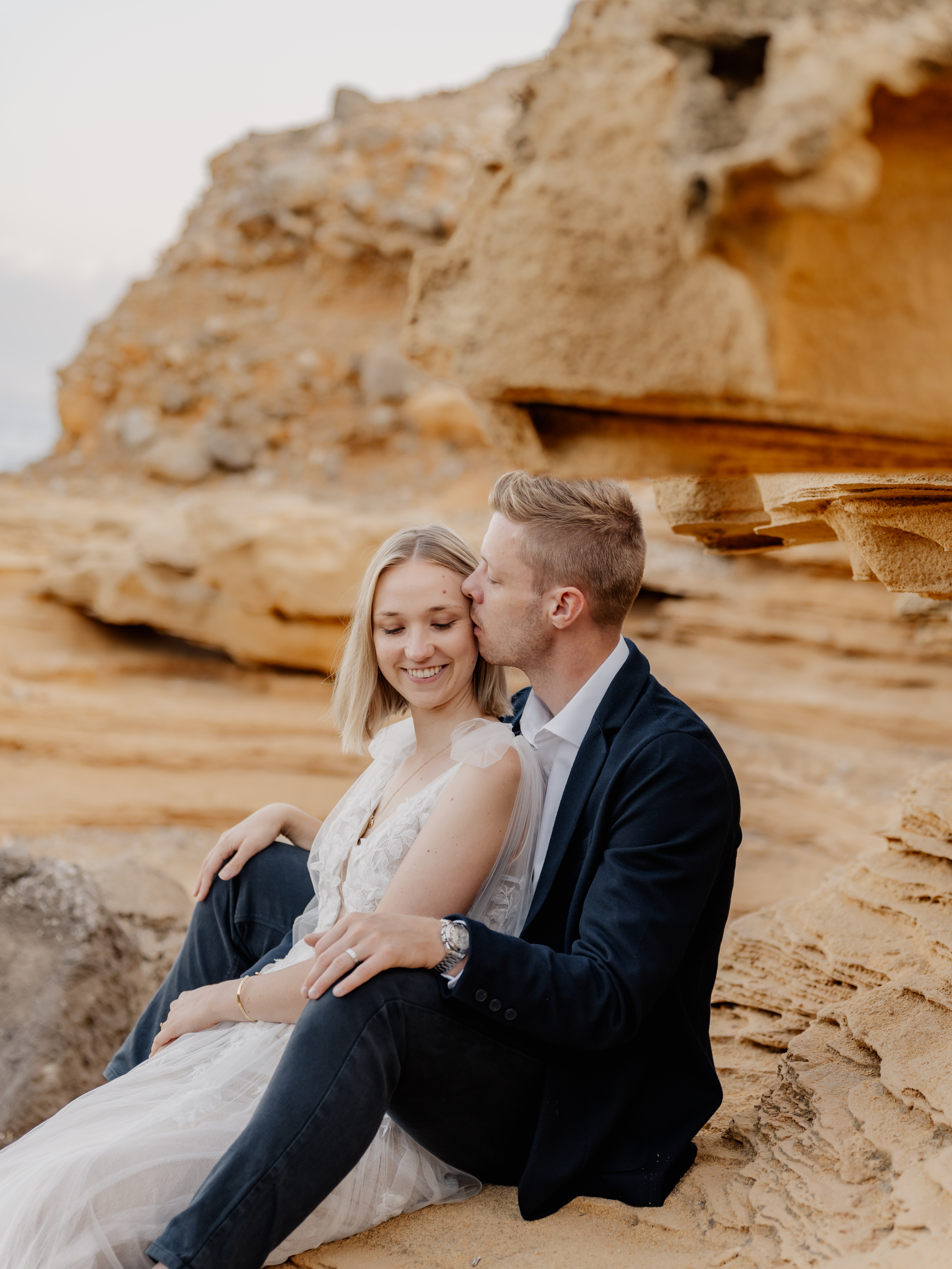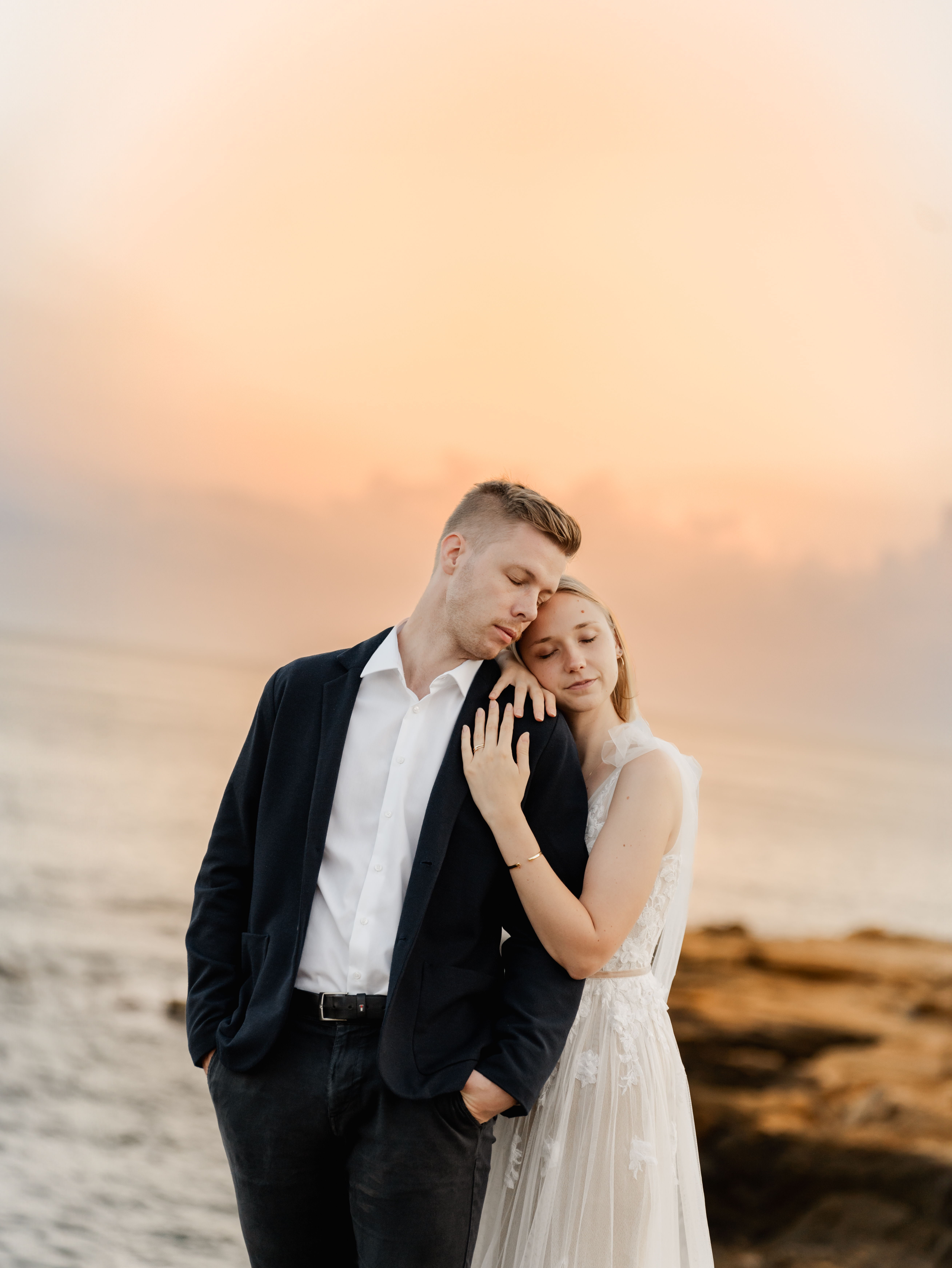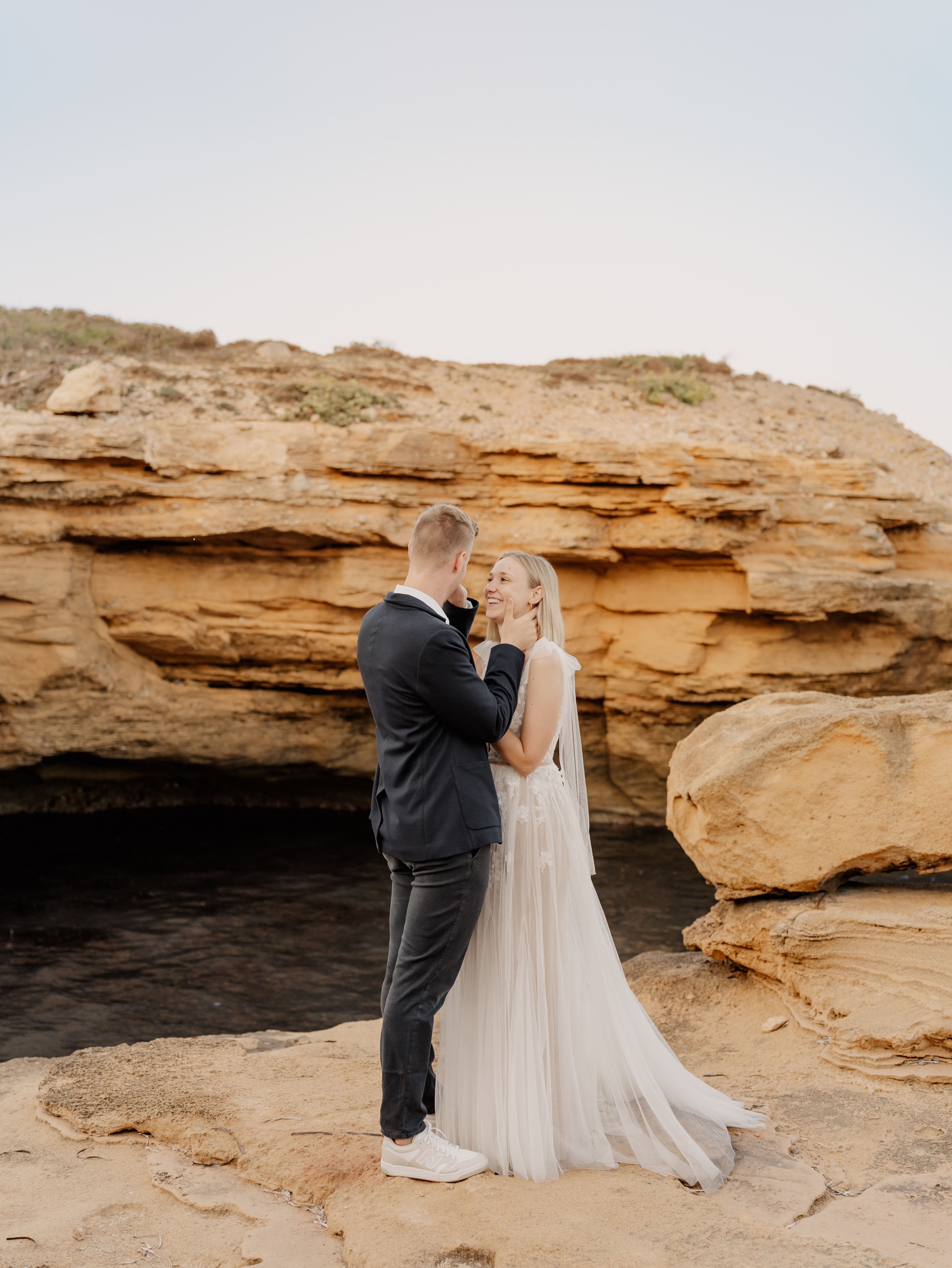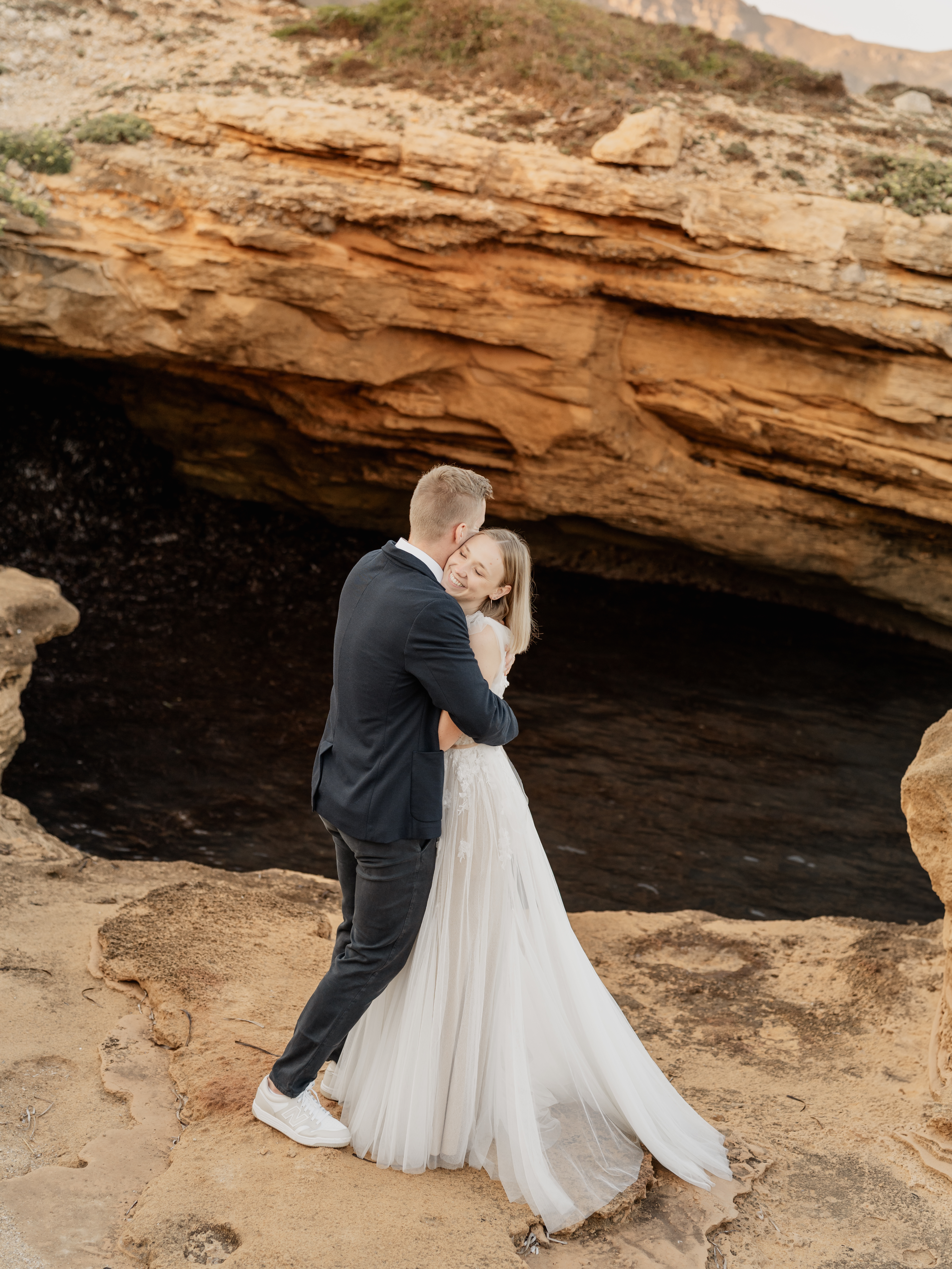 Denn an unserem Hochzeitstag regnete es unaufhörlich. Das Brautpaarshooting, auf das ich mich als Braut und Fotografin so sehr gefreut hatte, war nicht möglich. Doch ich wusste: diese Bilder würden wir nachholen. Und zwar an einem Ort, der für uns beide viel bedeutet – während unserer Flitterwochen an den rauen Küsten von Mallorca, in der ersten Morgenstunde, wenn das Licht der Golden Hour die Insel in ein weiches, goldenes Leuchten taucht.