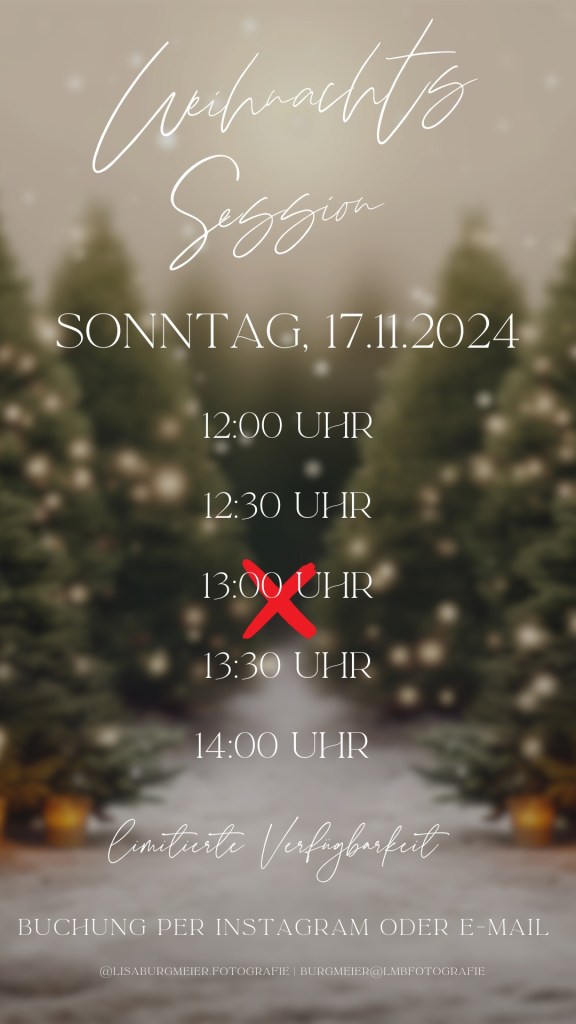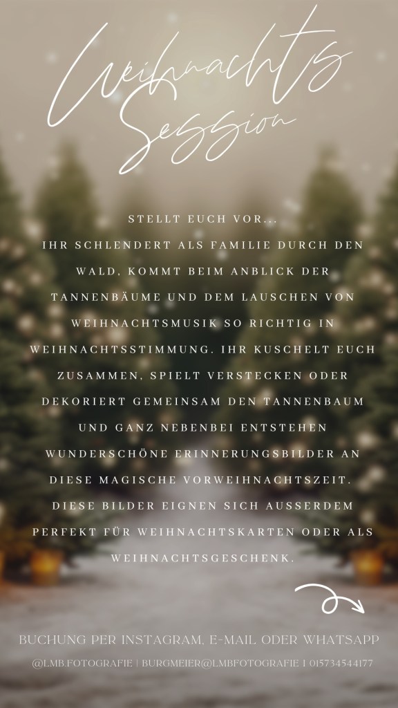 Das Jahr neigt sich dem Ende zu. Die Blätter fallen von den Bäumen und es schleicht sich allmählich die Kälte an. In den Geschäften gibt es inzwischen Adventskalender zu kaufen und in 3 Wochen ist schon der 1. Advent. Passend zur Einstimmung auf die Weihnachtszeit biete ich jährlich eine besondere Weihnachtsmini-Fotoaktion auf einer Tannenbaumkultur in Wiesbaden-Naurod an. Umgeben von Tannenbäumen mit weihnachtlicher Dekoration und Weihnachtsmusik entstehen spielerisch wunderschöne Bilder mit ihrer Familie. Die Kinder können Verstecken spielen, Tannenbäume schmücken, kleine Geschenke aufpacken, von Baumstämmen hüpfen und vieles mehr. Es sind sowohl weihnachtliche Fotos als auch normale (Familien-)bilder im Tannenwald möglich. Die Weihnachtsminis dauern ca. 20 Minuten und sind ideal für Familien mit Kindern, die keine Lust auf lange Fotosessions haben. Selbstverständlich sind auch (Ehe-)Paare und Vierbeiner herzlich Willkommen!